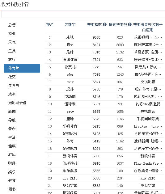 行業(yè)詞:搜索指數(shù)排行,我們可以查看商業(yè)、天氣、工具、旅行、體育、社交等各行業(yè)高指行業(yè)詞,從搜索結(jié)果數(shù)中開發(fā)者可以判斷競爭難度,然后再查看搜索結(jié)果排名第一的應(yīng)用,了解競爭對手排名與在關(guān)鍵詞的一些情況。