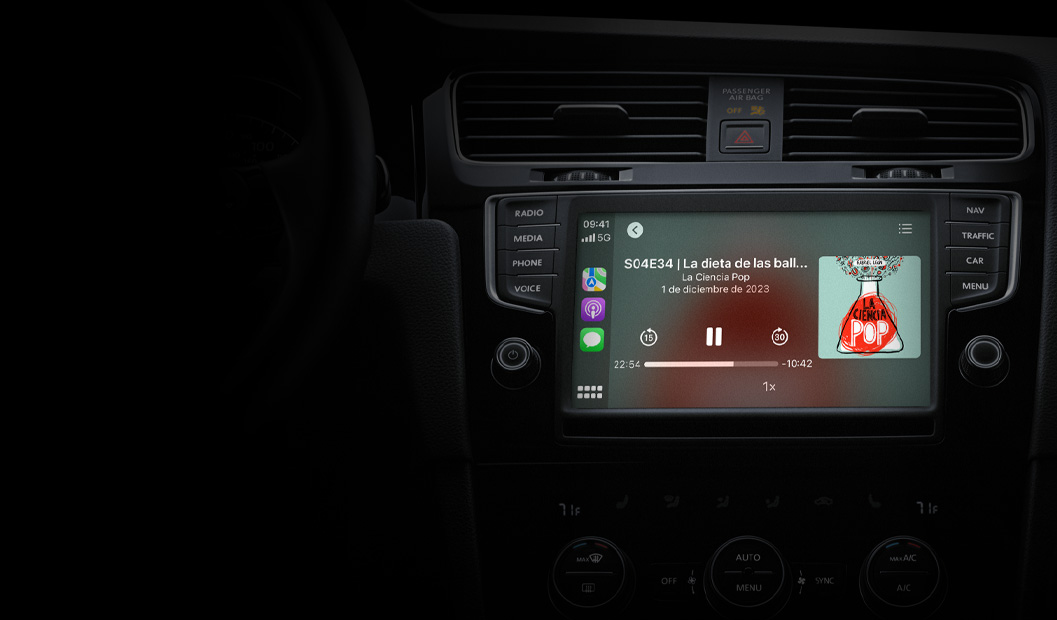 • CarPlay te permite conectar el iPhone a la pantalla integrada de tu auto y está disponible en más de 800 modelos diferentes. CarPlay facilita el acceso a Apple?Podcasts mediante la pantalla táctil de tu vehículo o con Siri. Apple?Podcasts también viene preinstalado en algunos autos.