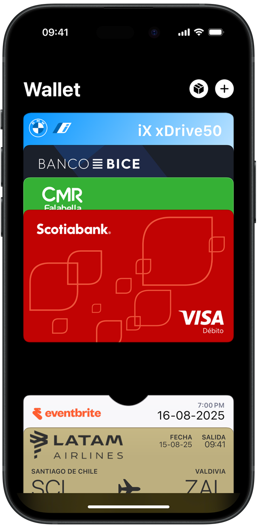 La app Wallet está en tu iPhone para que puedas guardar de?forma segura y en un solo lugar tus tarjetas de crédito y débito, tarjetas de embarque, entradas de eventos y más.2 Además, funciona con el iPhone y?el Apple?Watch, para que tengas a mano muchas más cosas, llevando encima