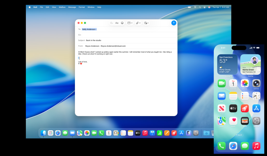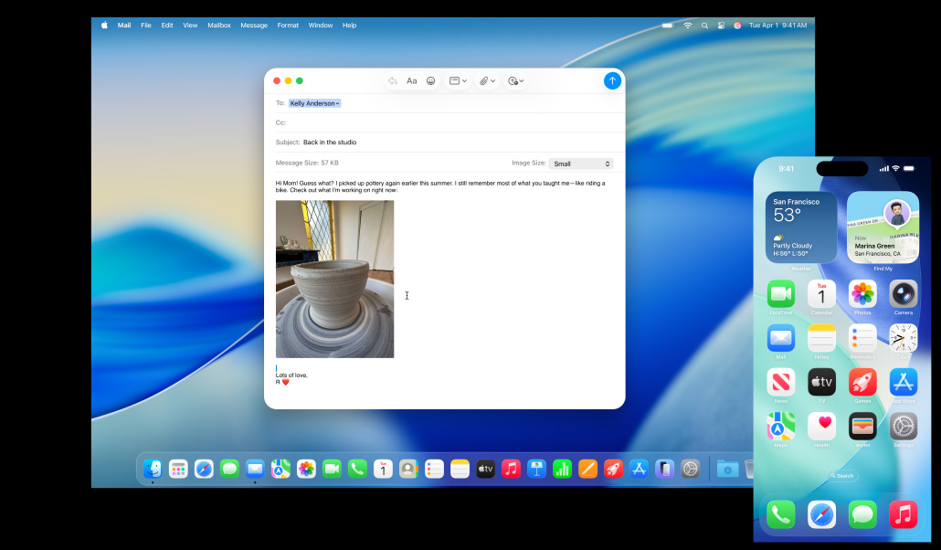 iPhone?Mirroring lets you see and use your iPhone right from your Mac.5 So even if your phone is getting charged across the room, you can still access all your favorite iPhone apps. Live?Activities from your iPhone also appear on your Mac. So when timely events occur — like when your Uber arrives — you don’t have to reach for your phone to stay in the?know. You can even drag and drop a video from your Mac to your iPhone, so you can continue editing on the go.