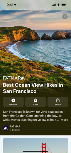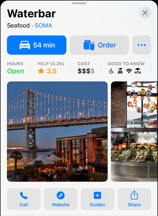 Choose a destination, and its interactive place card shows you everything you need at a glance. See basics like address, hours, website, and phone number, along with details like price range, photo galleries, associated Guides, accepted payment types — even whether you can bring your dog. Launch Flyover or Look Around to get a sense of the location and surroundings. You can even quickly and securely rent a bike, pay for parking, order food, and more with just a tap. And for places that use Business Chat, you can reach out and ask questions directly in Messages.