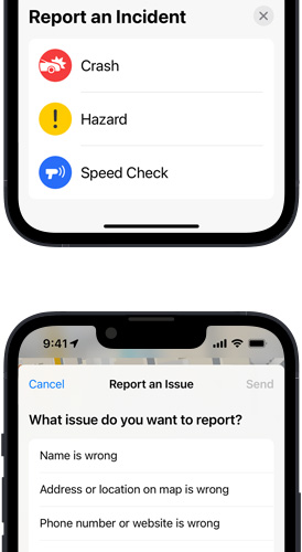 Incorrect lunch hours listed at your favorite cafe? Old mattress in the middle of the highway? Whatever issue you encounter, it’s fast and easy to report it in Maps. Edit and submit updated information about a business directly in the place card interface. And report an accident, hazard, or speed check safely and easily with Siri. Just say “There’s an accident up ahead” or “There’s something on the road” and Siri will file the incident for you. If an incident displayed on the map has been cleared, you can report that, too — all while keeping your hands free and your focus on the road.