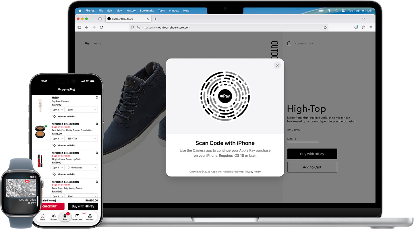 In apps and online. Use Apple?Pay to seamlessly make purchases in Safari and other browsers — on iPhone, iPad, Mac and other computers — without the lengthy checkout forms. On an Apple device, click or tap the Apple?Pay button and pay with a touch or glance. On a non?Safari browser, scan the Apple?Pay code with your iPhone camera and use your iPhone to complete your?purchase.2