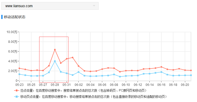 上圖我標(biāo)記出來的地方就是移動(dòng)適配出現(xiàn)了大幅度的波動(dòng),所在那幾天我的網(wǎng)站流量波動(dòng)的非常厲害,所以每天看看移動(dòng)適配的波動(dòng)大不大,如果發(fā)現(xiàn)昨天和當(dāng)天上升幅度很大,一定要搞清楚這兩天做了哪些操作,然后去準(zhǔn)備應(yīng)對(duì)大幅度下降的可能。