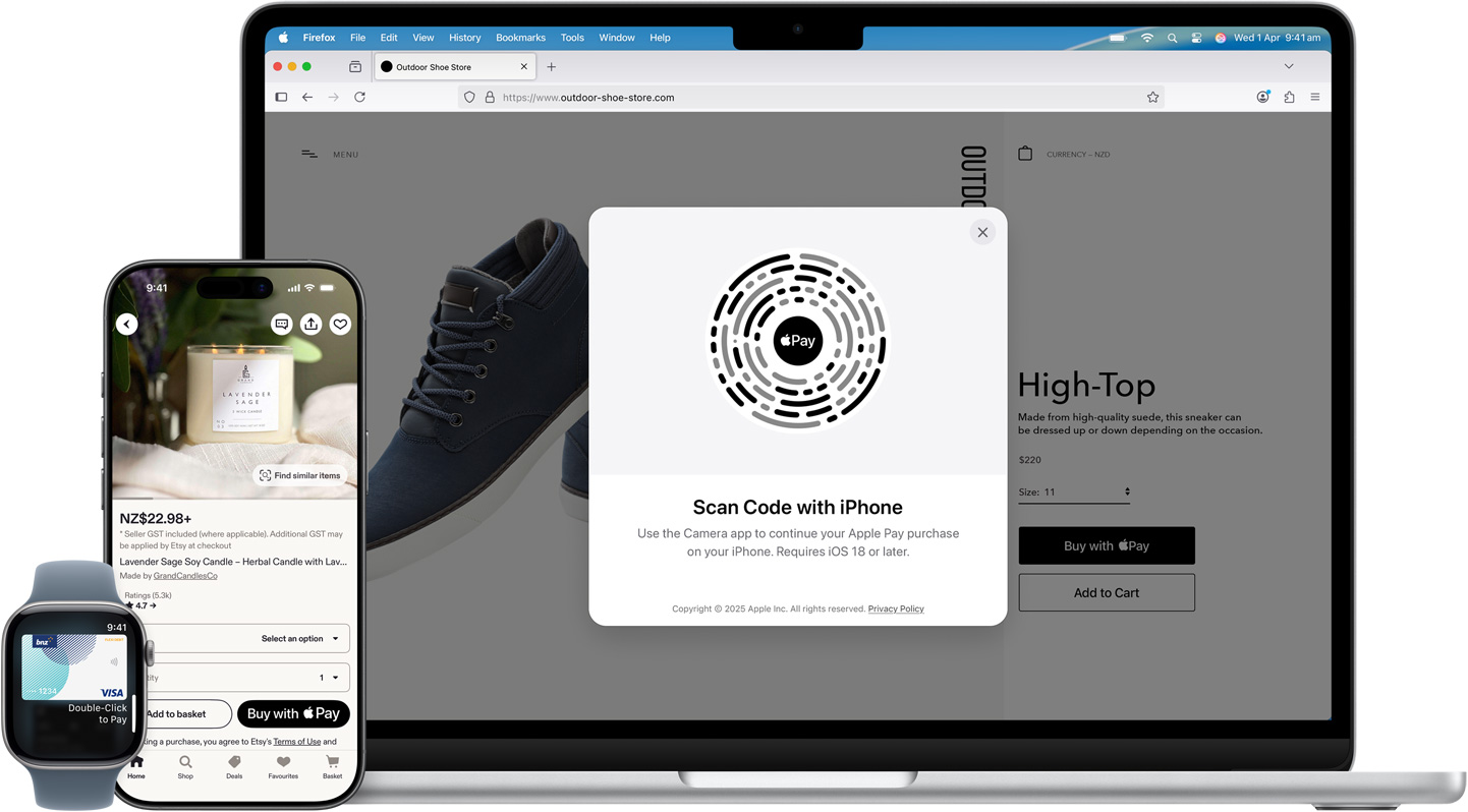 In apps and online. Use Apple Pay to seamlessly make purchases in Safari and other browsers — on iPhone, iPad, Mac and other computers — without the lengthy check-out forms. On an Apple device, click or tap the Apple Pay button and pay with a touch or glance. On a non-Apple device, scan the Apple Pay code with your iPhone camera and use your iPhone to complete your purchase.2