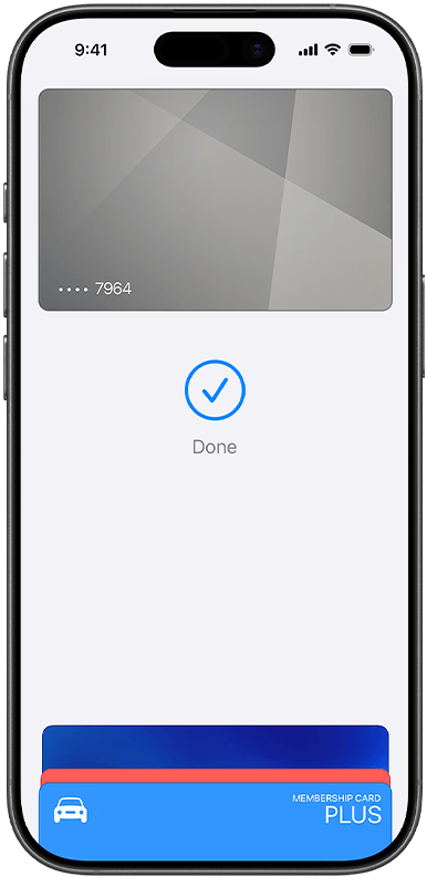 Konfigurujesz b?yskawicznie. Bezpo?rednio na iPhonie. Apple Pay jest wbudowane w iPhone’a, Apple Watch, Maca i iPada. Aby skonfigurowa? je na iPhonie, otwórz apk? Portfel i stuknij symbol plusa. Nast?pnie dodaj kart? kredytow? lub debetow?, przyk?adaj?c j? do tylnej cz??ci iPhone’a1. Mo?esz od razu doda? kart? tak?e do innych swoich urz?dzeń. Chcesz zap?aci?? Kliknij dwukrotnie, przy?ó? i gotowe. Nadal otrzymujesz nagrody i korzy?ci zwi?zane z kart? – nie stracisz wi?c ?adnych punktów ani mil.